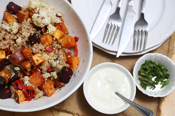 This delightful dish is a celebration of wholesome roasted sweet potato, beetroot and caulini with pearl couscous and fragrant mint. We've added some dukkah and roasted almonds for extra flavour and crunch, then topped it off with a drizzle of garlicky yoghurt.